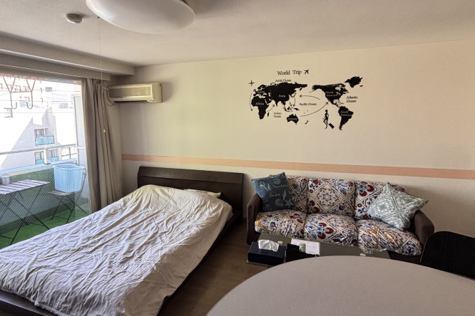 3人掛けソファー1台、ダブルベット1台、2人までご宿泊可能。
